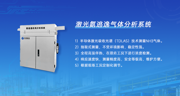 氨逃逸在線分析系統是天禹智控自主研發新型在線監測系統,該產品基于可調諧激光吸收光譜技術(TDLAS)的原理,可測量NH3、H2S、HCL、HF等氣體濃度。預處理系統采用熱濕法設計,該系統具有靈敏度高、響應速度快、不受背景氣體干擾、非接觸式光學測量等特點,為實時準確地反映逃逸氨的變化提供了可靠保證。