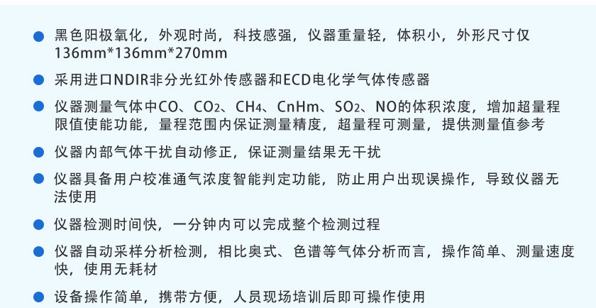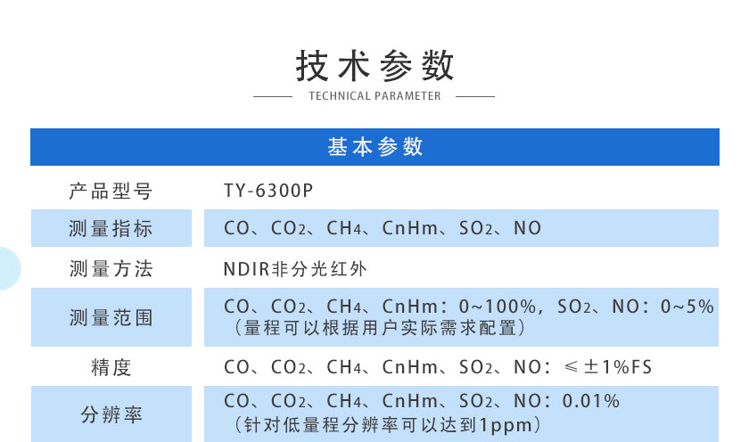 CO、CO2、CH4、CnHm、SO2、NO:0.01%(針對低量程分辨率可以達到1ppm)