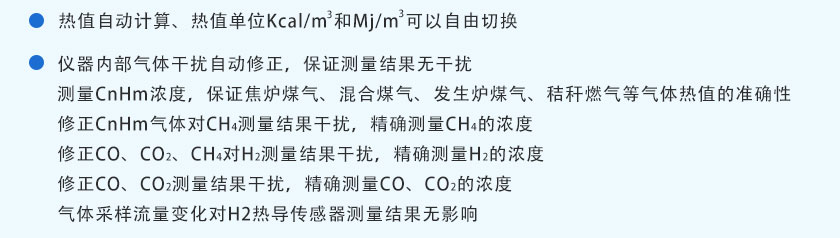 紅外煤氣成分及熱值分析儀采用進(jìn)口NDIR非分光紅外傳感器,長(zhǎng)壽命電化學(xué)傳感器和基于MEMS的熱導(dǎo)傳感器,運(yùn)用先進(jìn)的數(shù)字處理技術(shù),可同時(shí)在線測(cè)量煤氣、生物燃?xì)庵蠧O、CO2、CH4、H2、O2、CnHm等六種氣體的體積濃度,根據(jù)氣體濃度值快速準(zhǔn)確計(jì)算出相應(yīng)的熱值。