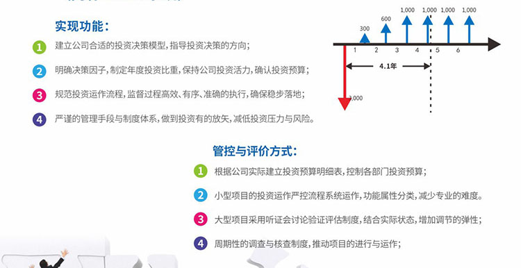 系統(tǒng)特色:規(guī)范投資管理的模型執(zhí)行落實,實現(xiàn)與財務(wù)收益的一體化,嚴(yán)控投資的方向與效益,實現(xiàn)投資盈利。