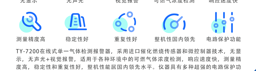 采用進口催化燃燒傳感器和微控制器技術,無顯示,無聲光+視覺報警,適用于各種環境中的可燃氣體濃度檢測,響應速度快,測量精度高,穩定性和重復性好,整機性能居國內領先水平。儀器具有多種超強的電路保護功能,可防止錯接電源、反接電源、電源短路、電源不穩、電源與信號錯解等,導致的儀器損壞。