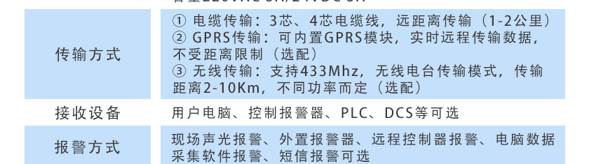 ①電纜傳輸3芯、4芯電纜線,遠距離傳輸(1-2公里)②GPRS傳輸可內置GPRS模塊,實時遠程傳輸數據,不受距離限制(選配)③無線傳輸支持433Mhz,無線電臺傳輸模式,傳輸距離2-10Km,不同功率而定(選配)