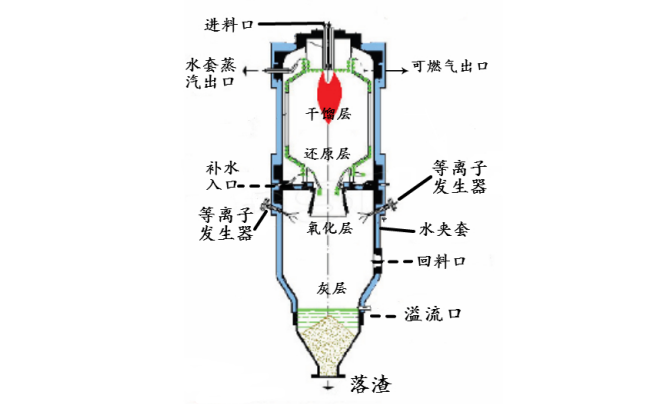 等離子氣化爐中產(chǎn)生的等離子體,由等離子火炬采用380V交流電產(chǎn)生。等離子體的發(fā)生裝置功率在5kW~300kW,溫度可達(dá)4000℃~7000℃,射流速度超過(guò)200m/s,工作氣體為氮?dú)狻⒖諝狻錃獾取T诟邚?qiáng)度熱源下,基本粒子的活動(dòng)能量遠(yuǎn)大于任何分子間化學(xué)鍵的作用,物質(zhì)的微觀運(yùn)動(dòng)以原子熱運(yùn)動(dòng)為主,原有物質(zhì)被打碎為原子物質(zhì),以破壞有害成分或使其喪失活力,從而將復(fù)雜的物質(zhì)轉(zhuǎn)化為簡(jiǎn)單的無(wú)害物。