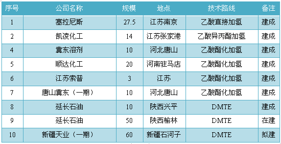 我國(guó)當(dāng)前主要的煤制乙醇項(xiàng)目如表1所示。