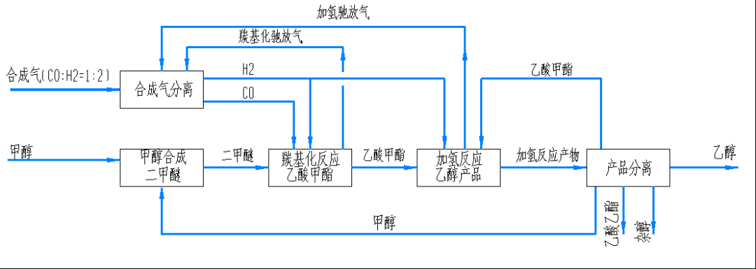 其中DME可來源于合成氣直接合成,也可經(jīng)甲醇脫水得到,分離雜質(zhì)后,二甲醚汽化與CO混合進(jìn)入羰基化反應(yīng)器,生成乙酸甲酯(MAC),分離雜質(zhì)后乙酸甲酯與氫氣在加氫反應(yīng)器中生成乙醇和甲醇,經(jīng)分離后乙醇作為產(chǎn)品,甲醇返回二甲醚合成單元作為原料又可循環(huán)利用。