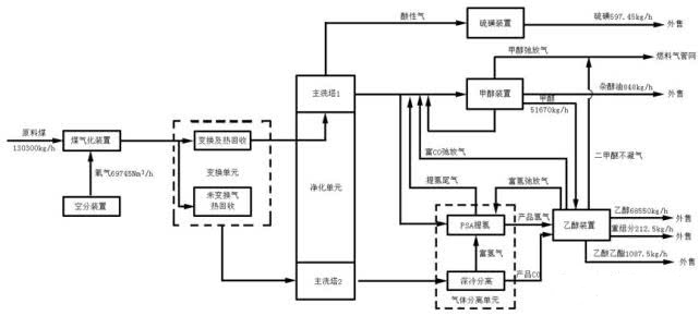 該項(xiàng)目以西灣露天煤礦為原料,采用HT-L煤氣化技術(shù)生產(chǎn)粗煤氣,其中一股粗煤氣進(jìn)行變換,另一股粗煤氣進(jìn)行余熱回收利用,再分別經(jīng)過低溫甲醇洗脫除其中的硫和二氧化碳,未經(jīng)變換的煤氣凈化后經(jīng)過深冷分離為H2和CO,經(jīng)變換的煤氣部分送PSA制氫、部分送甲醇合成裝置生產(chǎn)甲醇,CO、H2和甲醇送乙醇裝置。流程示意如圖1。