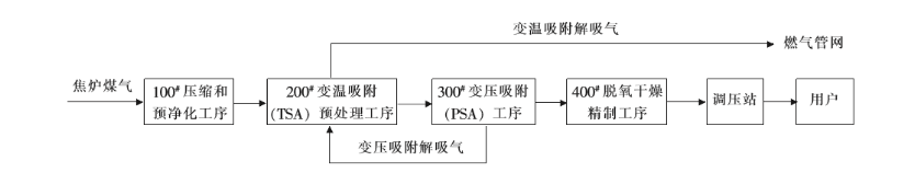 1)壓縮和預(yù)凈化工序:將處于常壓的焦?fàn)t煤氣脫去萘、苯、焦油和部分H2S、NH3等,然后送入變溫吸附工序。