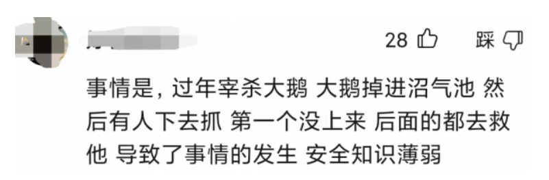 2020年11月15日早晨,四川省樂山市井研縣馬踏鎮(zhèn)發(fā)生一起農(nóng)村家庭沼氣意外事故,造成4人死亡。經(jīng)調(diào)查,死者周某光在自家窖池腌制豬草發(fā)生沼氣中毒,死者親戚周某安、周某洪、張某巧先后發(fā)現(xiàn)后,下窖池救援,全部沼氣中毒,搶救無效死亡。