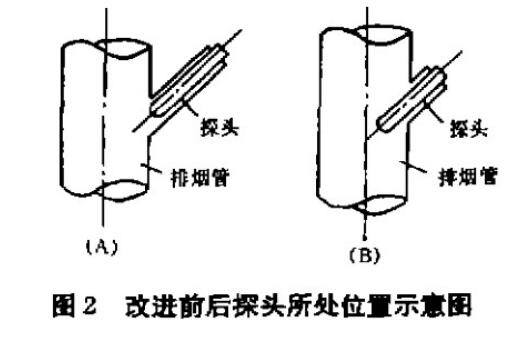 采樣過濾探頭通過套筒裝在專門敷設的窯尾排煙管上。原設計采樣探頭裝在套筒內,不插入排煙管,如圖2(A)所示。探頭所處位置溫度較低,樣氣水分在探頭周圍凝結,使落在探頭上的粉塵變濕,造成反吹困難,其結果套管內積滿濕粉塵,致使采樣探頭嚴重堵塞,阻礙系統正常運行。為此,將采樣探頭伸入排煙管內10cm,如圖2(B)所示。這樣落在探頭上的粉塵會因高溫氣流作用快速烘干,易被反吹空氣吹落,從而保證了采樣探頭暢通,延長了探頭使用壽命。