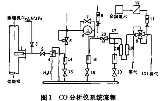 采樣過濾探頭安裝在焙燒窯窯尾處專門敷設的取樣管道上。啟動泵6,樣氣從采樣點取出,先經過濾探頭1濾去其中之粉塵,再經凝水器4進行一次除水后,大部分樣氣通過旁路排放掉,只有少量氣樣送至后級進行測量用。電子除濕器17對被測氣樣進行二次除水,再經干燥器18、19干燥,這樣就基本上排除了樣氣中的水分。然后樣氣經四通切換閥9、流量計11送至一氧化碳分析儀12進行分析。分析結果傳送到窯前記錄儀顯示。為操作者提供信息。