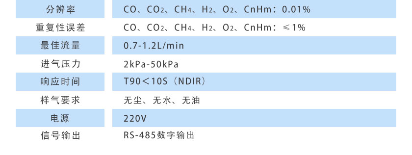 CO、CO2、CH4、H2、O2、CnHm:≤1%