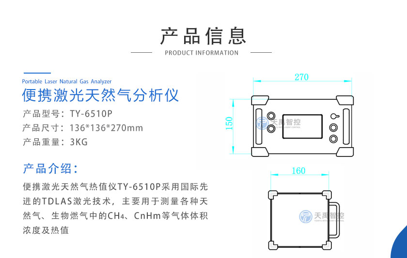 采用國際先進的TDLAS激光技術,主要用于測量各種天然氣、生物燃氣中的CH4、CnHm?等氣體體積濃度及熱值。 武漢天禹智控研發的在線激光天然氣熱值儀標準化機箱、測量精度高、結構簡單、維護方便,軟件功能強大,可拓展性強、現場實用性好,目前暢銷國內外。 適用于高校、環境科研機構,燃氣計量檢測部門、節能監測部門,液化氣廠、液化氣站、天然氣公司等直接用戶,燃氣具生產企業、廠商測量可燃氣體不同成分的體積濃度和熱值。