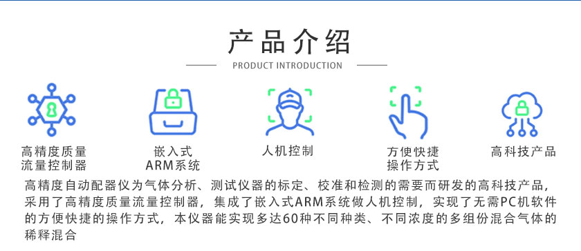 為氣體分析、測試儀器的標定、校準和檢測的需要而研發的高科技產品,采用了高精度質量流量控制器,集成了嵌入式ARM系統做人機控制,實現了無需PC機軟件的方便快捷的操作方式。本儀器能實現多達60種不同種類、不同濃度的多組份混合氣體的稀釋混合。該產品廣泛應用于科研院所、生物制藥、環境監測等需要混合氣體的場合和單位。