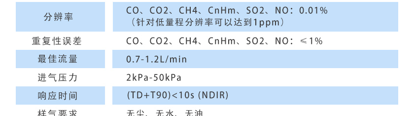 CO、CO2、CH4、C3H8、SO2、NO:0.01%(針對低量程分辨率可以達到1ppm)