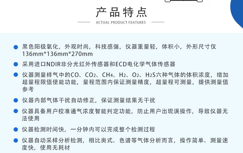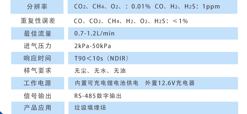 采用國際先進的NDIR非分光紅外技術和ECD電化學技術,主要用于測量垃圾填埋場中的CO、CO2、CH4、H2、O2、H2S等六種氣體體積濃度和燃氣熱值。